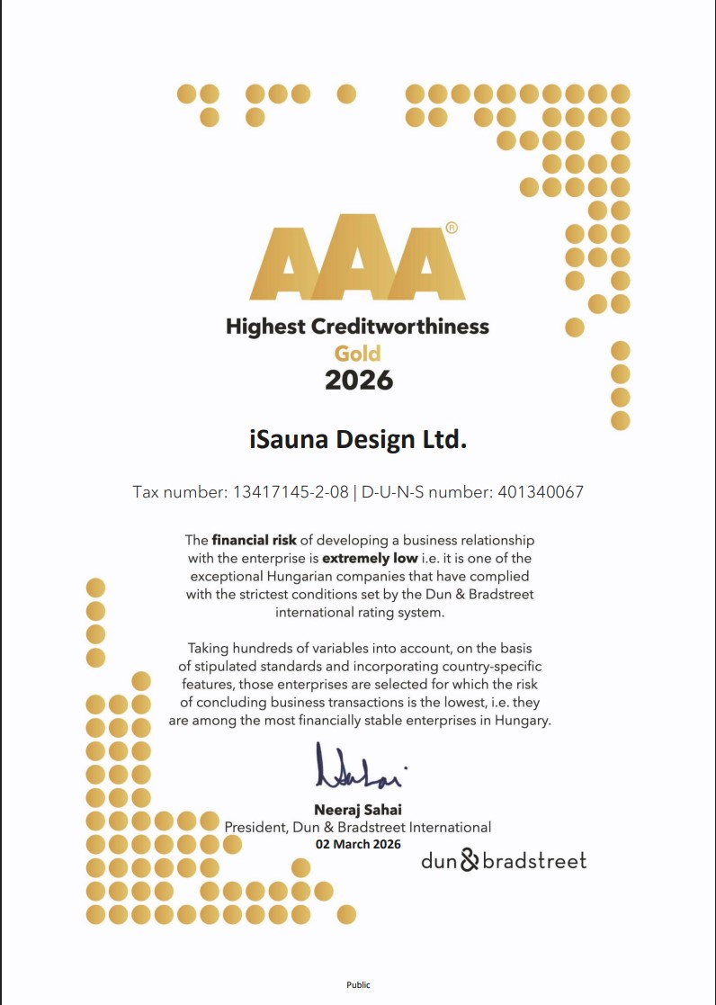 Spoločnosť ISauna Design Kft. získala certifikát Dun & Bradstreet AA (dvojité A), čo znamená, že finančné riziko nadviazania obchodného vzťahu s nami je veľmi nízke.